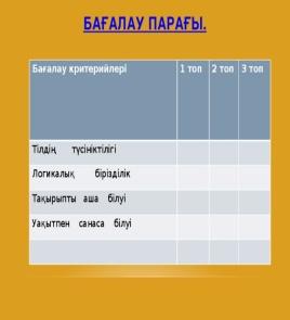 Дескриптор: Жалпы - 2 балл. -Тапсырмаларды орындайды. -Баяндайды -Пікір таластырады