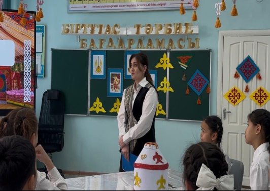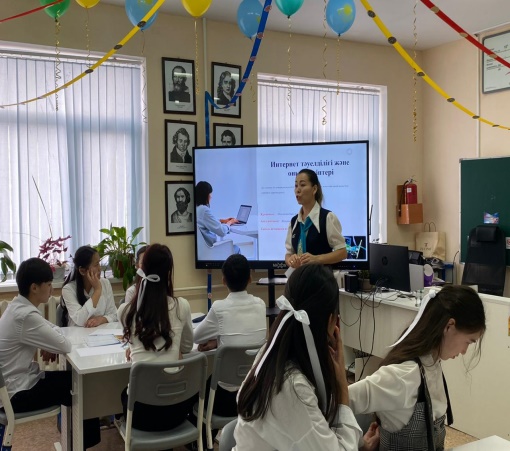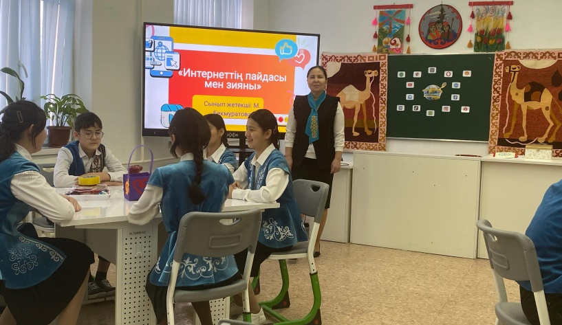 Құндылықтар: Жасампаздық және жаңашылдық айы. Апта дәйек сөзі: Жаңашылдық – заман талабы екнін таныстырып, "Интернетсіз өмір: Тәуелділіктен еркіндікке", "Жаңа дәуірдің тұзағы: Интернет тәуелділігінің әсері" тақырыбында видеоролик көрсету арқылы, "Өткенді ұлықтап, болашаққа бағдар" тақырыбында сергіту сәті, "Цифрлық әлем мен шынайы өмір: Сәйкестендіріп көр" тақырыбында тапсырмалар орындап, сабақ жоғары деңгейде ұйымдастырды. Қатысқан қонақтар өз пікірлерін білдірді.