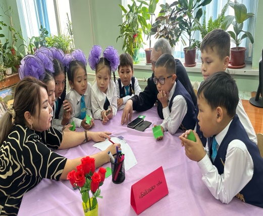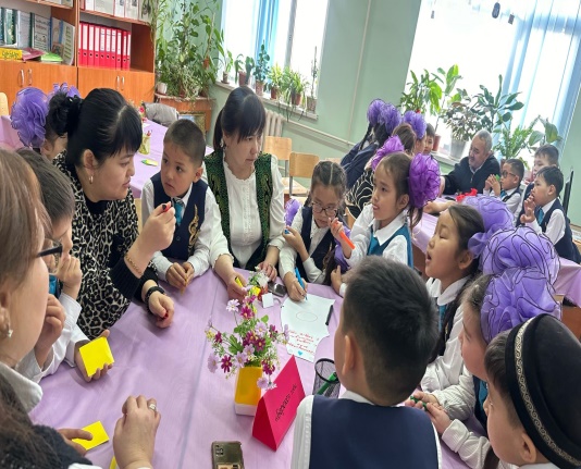 4.Бастауыш сынып мұғалімдері- Д.Танирбергенова мен Б.Дуйсебаева «Уақыттың бос өткені, өмірдің бос кеткені» тақырыбында 2 сынып оқушыларымен дует сабақ ұйымдастырды. Сабақ қонақтарды жақсы көңіл күймен күтіп алып, көрініс көрсетумен басталды. Оқушылар белсенді қатысып, жан-жақты тақырып аясында тапсырмалар орындалды. Қонақтарды топтарға қосып, оқушылармен де тапсырмалар орындалып, апта дәйек сөздері, құндылық, қауіпсіздік т.б . толық қамтылды.