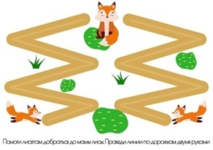 «Нейрогимнастика» жаттығуы. Екі қолыңмен бірдей жүргізіп, түлкінің балаларына түлкіге жетуге көмектесіңдер.