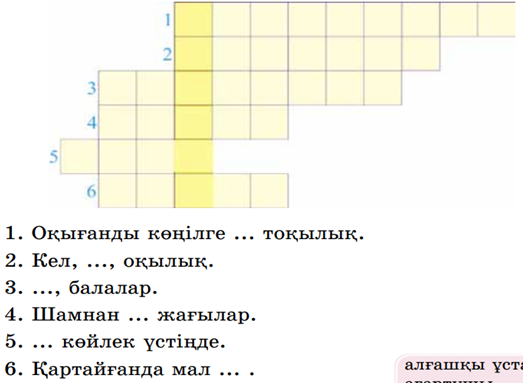 ҚБ: Жарайсың! Дескриптор: -автор жайлы мәлімет алады Дескриптор: Сөзжұмбақты дұрыс шешеді сарғыш түсті торкөздегі есімді анықтайды Дескриптор: - Ыбырай Алтынсарин жайлы мәлімет алады Дескриптор: Өлеңді мәнерлеп оқиды Дескриптор: Топтық жұмыс орындайды