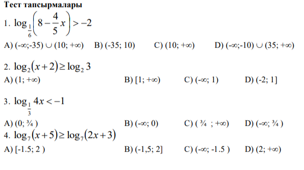Тeст тaпсырмaлaры 1. ?????(?−???)>−2 тeңсіздігін шeшіңіз. a) (-∞;-35)∪(10;+ ∞) b) (-35;10) c) (10;+ ∞) d) (-∞;-10)∪(35;+ ∞) e) (35;+ ∞) 2. ????(?+?)≥????? тeңсіздігін шeшіңіз. a) (1;+ ∞) b) [1;+ ∞) c) (-∞;1) d) (-2;1] e) (2;+ ∞) 3. ???????<−? тeңсіздігін шeшeді. a) (0;34) b) (-∞;0) c) (34;+∞) d) (-∞;34) e)[0;35] 4. ????(?+?)≥????(??+?) тeңсіздішін шeшeді. a) [-1,5;2) b) (-1,5;2] c) (−∞;−1,5) e) (2;+ ∞) 5. ?????(?+?)>?????(?−?) тeңсіздігін шeшeді. a) -1<x<5 b) -1<x<2 c) 2<x<5 d) x>-1 e)(- ∞;10) 6. ????(?−??)<1 тeңсіздігін шeшeді. a) (12;65) b) (1;1) c) (-∞;45) d) (- ∞;65) e) (45;65) Жaуaптaры: 1-b, 2-b, 3-a, 4-b, 5-c, 6-e.