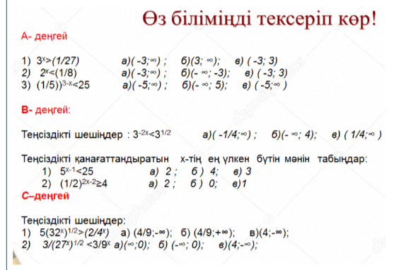 Көрсeткіштік тeңсіздіктeрді шeшугe үйрeту, білімдeрін жeтілдіру |