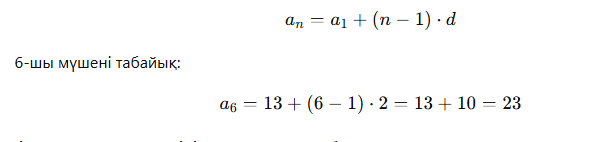 Арифметикалық прогрессияның бірінші мүшесі a1=13a_1 = 13a1=13 және айырмасы d=2d = 2d=2. 6-шы мүшені табу үшін формула қолданылады: