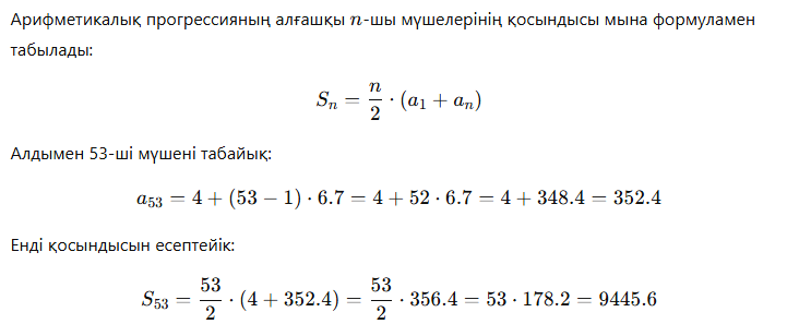 Арифметикалық прогрессияның алғашқы nnn-шы мүшелерінің қосындысы мына формуламен есептеледі: