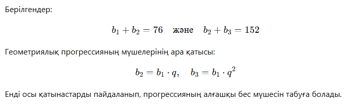 4. Геометрилық прогрессияда b1+b276; b2+b3=152 Прогрессияның алғашқы бес мүшесін табыңыз,