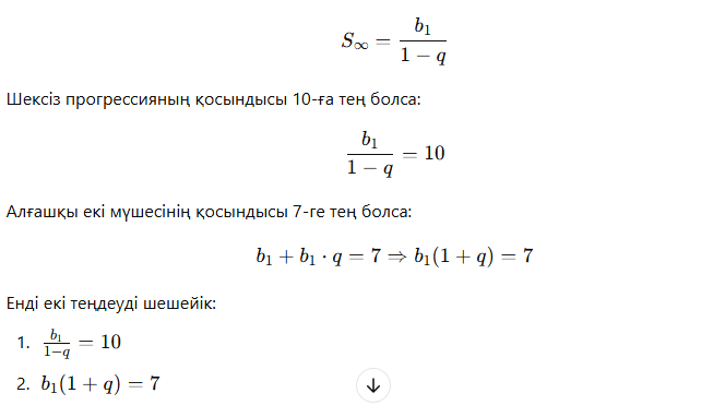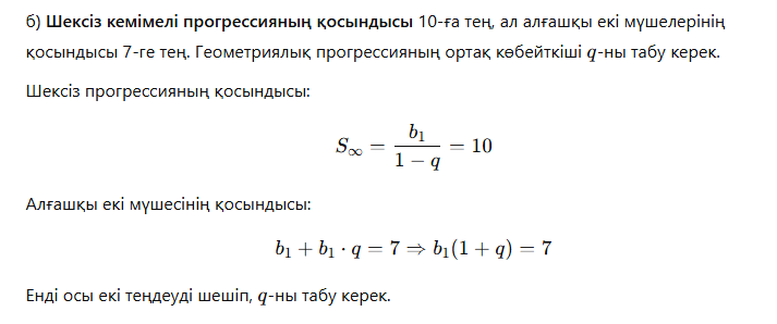 б) Шексіз кемімелі прогрессияның қосындысы 10-ға, ал алғашқы екі мүшелерінің қосындысы 7-ге тең. Геометриялық прогрессияның ортақ көбейткіші qqq-ні табу қажет.