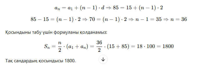 Тақ сандар тізбегі 15, 17, 19, ..., 85 болып табылады. Бұл арифметикалық прогрессия:
