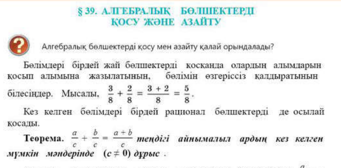 Бөлімдері бірдей алгебралық бөлшектерді қосу және азайту жай бөлшектерді қосу және азайту ережесі бойынша орындалады.