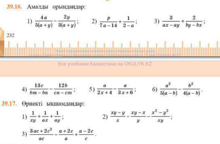 7.2.1.19алгебралық бөлшектердіқосу және азайтуды орындау; 7.2.1.20алгебралық бөлшектерді көбейту және бөлуді, дәрежеге шығаруды орындау; |