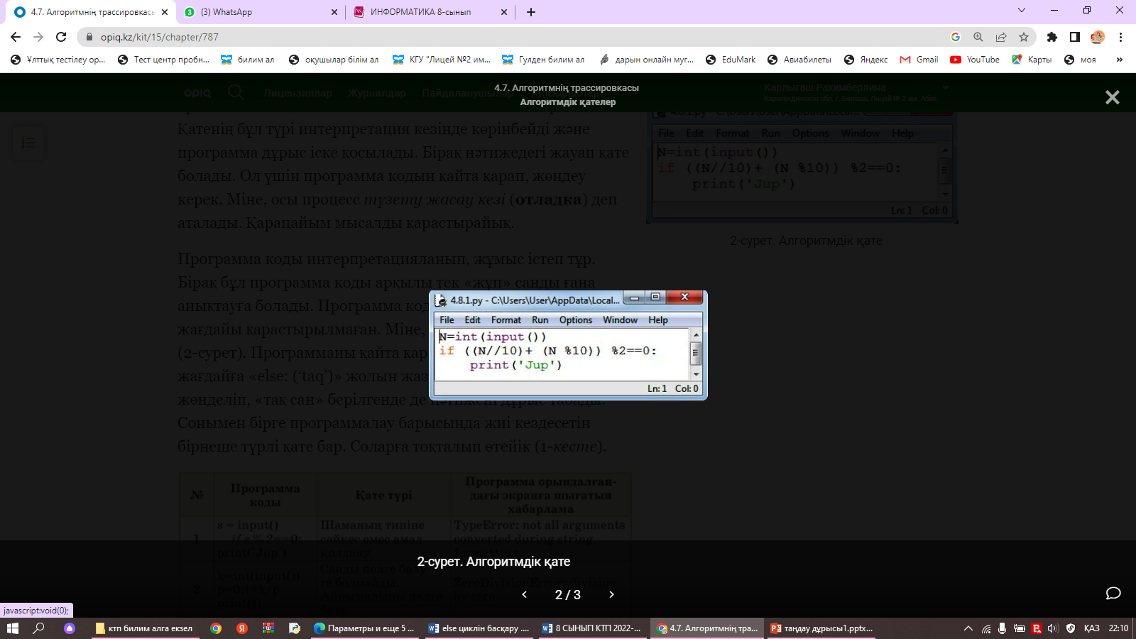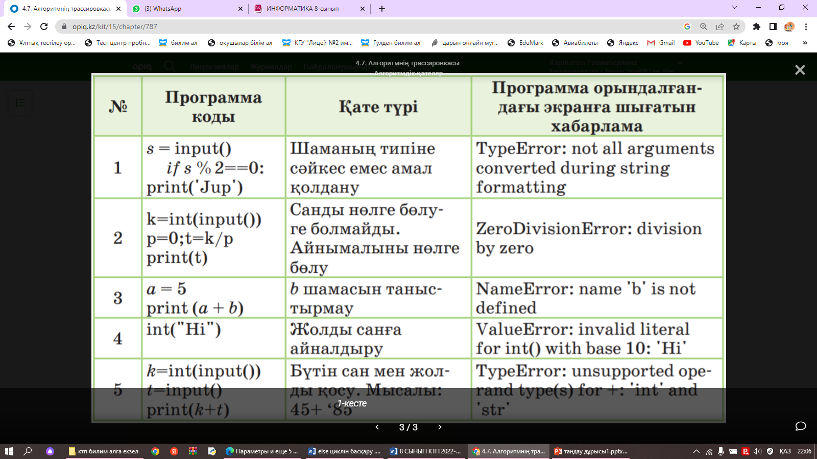 Жаңа тақырыпты презентация арқылы түсіндіреледі. Кез келген программалау тілінде жазылған программаны дер кезінде реттеп, түзетуге (отладка) болады. Программалау тілінде қателерді түзететін өз құралдары бар. Программалаушылар өз тілінде программада жіберілген қателерді багтар (ағылшын тілінде «bug» – «қате»), программа кодын түзетуді – дебаггер (ағылшын тілінде «debugger» – «түзетуші») деп атайды. Python тілінде де қатені жөндеп, программаны түзететін, реттейтін өз құралдары бар. Программалаушылар программа жазуда 3 түрлі қате жіберуі мүмкін. Олар: • синтаксистік; • программаның орындау уақытына байланысты; • алгоритмдік қателер.