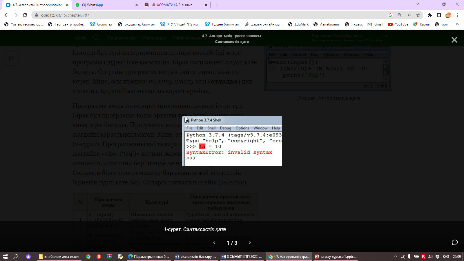 Мұғалімді тыңдайды 1 тапсырма Дескриптор: - Python программасын іске қосады. - алгоритмдік қатені табады 2 тапсырма Дескриптор: - Python программасын іске қосады. - синтаксистік қатені табады 3-тапсырма Дескриптор: - Python программасын іске қосады. - алгоритмдңк қатені табады |