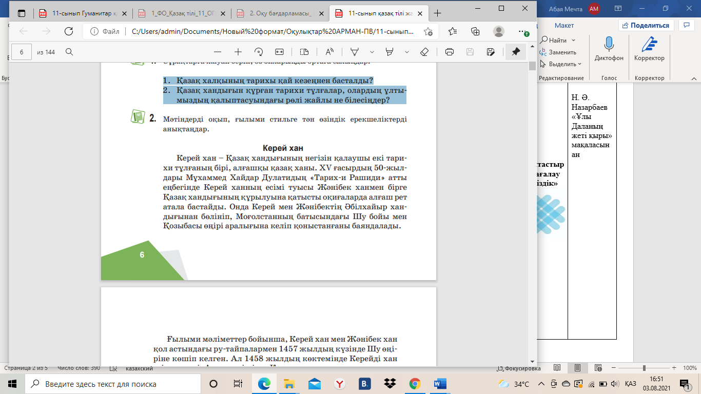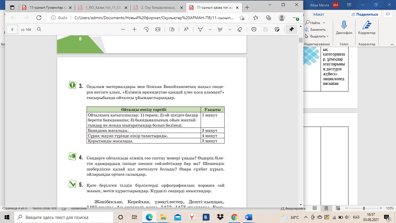 11.1.3.1 - мәтінде көтерілген мәселені (қоғамдық –саяси, ғылыми) талдай отырып, негізі ойды анықтау және ғаламдық мәселелермен салыстыру; 11.4.1.1 - мәнмәтін бойынша тілдік бірліктерді орфографиялық нормаға сай жазу; |