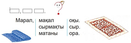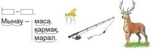 Мынау-маса. Мынау- қармақ. Мынау- марал. Марал, мақал оқы. Марал, сырмақты сыр. Марал, матаны ора. Жазылым. 1.Жазу дәптерімен жұмысты ұйымдастыру. 2.Орны ауыстырылып берілген сөйлемдерден мәтінді құрастырып жазу. Мынау – қармақ. Омар, қармақ сал. Сазан аула. Оқулықтағы тапсырманы жаз. Марал, матаны ора.