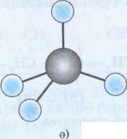б). Метан молекуласының кеңістіктік пішіні (а) мен шарөзекті (ө) жөне масштабты (б) модельдері