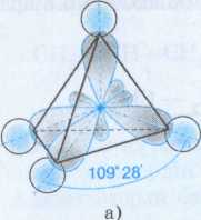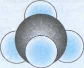 Көміртек атомының sp3 гибридтенген пішіні дұрыс емес гантель төрізді 4 е бұлты 4Н ат. шар s-бұлттарымен қаптасып химиялық байланыс түзіледі. Метан молекуласының кеңістіктік пішіні тетраэдр төрізді, С—Н байланыстарының осьтері араларындағы бұрыштар 109°28'. Тетраэдрдің төрт бұрыштарында Н, ал дәл ортасында С орналасады. Көміртек пен сутек атомдары арасындағы электрон тығыздығының қоюланған жеріне назар аударамыз.