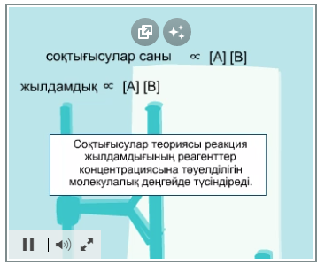 - Қайтымды реакциялар үшін әрекеттесуші массалар заңының қолданылатындығын түсіндіреді; - Химиялық реакцияның жылдамдығына концентрацияның әсерін молекулалық тұрғыда түсіндіреді; - Химиялық реакцияларды микроскопиялық деңгейде реагенттер молекулаларының соқтығысы ретінде сипаттайды; |