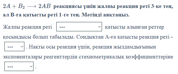 Дескриптор: Білім алушы -есептің шартын құрады; -Реакция теңдеуін жазады; -реакция жылдамдығын анықтайды. Тапсырма дұрыс орындағаны үшін 2 балл беріледі.