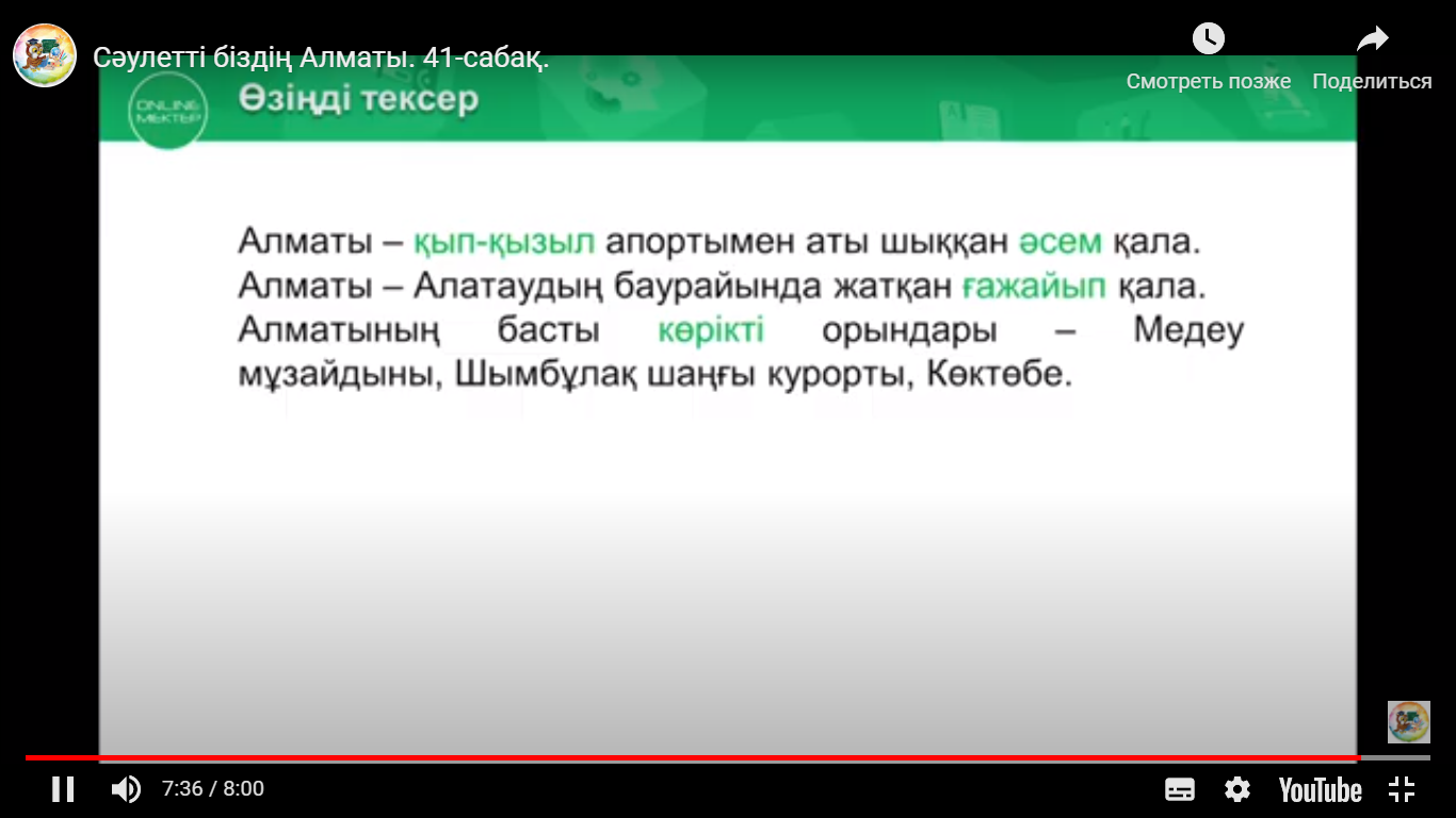 Біздің еліміздің ең әдемі, жасыл желекті, тау баурайындағы әсем қаласы. Әлемге әйгілі апорт алмасы бар. Жерасты жолы бар, субұрқақтар қаласы. Себебі 125-тен астам субұрқақ бар. Тұрғындар бір уақытта екі жыл мезгілін көре алады. Тау басында қалың қар, мәңгі мұз жатса, етегінде жарқыраған жаз болып тұрады. Белсенді оқыту:Оқылым және айтылым Оқулықпен жұмыс 1-жаттығу