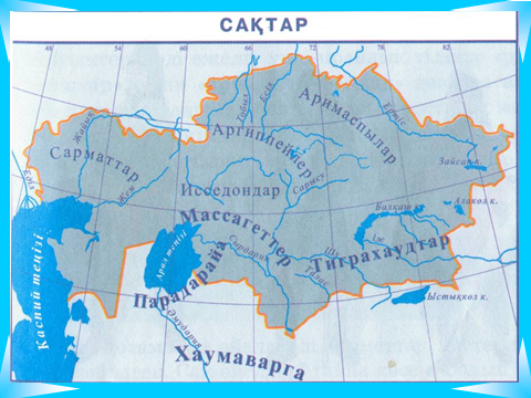 Тиграхауда- Жетісу Парадариа –Арал теңізі маңы Хаумаварга – Оңтүстікте хаом сусынын қайнататын Сақ-масагет – Арал маңы Савромат –сармат тайпалары Батыс Қазақстан Исседондар-Орталық Қазақстан Аргиппейлер –Солтүстік Қазақстан Аримаспылар –Шығыс Қазақстан Оқушылар өздері табу керек сақ тайпаларының орналасуын