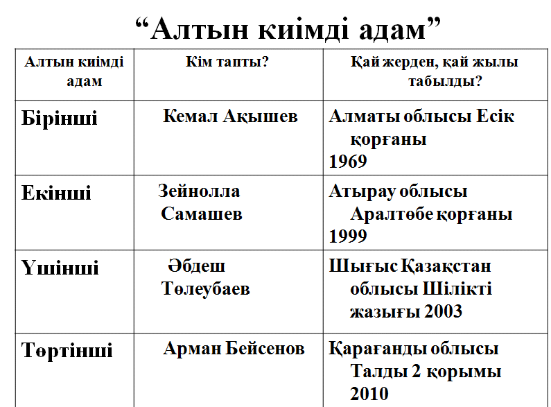 1-тапсырма. Мәтінді мұқият тыңдаңыз. Мәтінге сай негізгі ақпараттарды анықтаңыз. Сұрақтарға жауап беріңіз. (Алтын адам» туралы көрсету, табылған бұйымдар туралы айту).