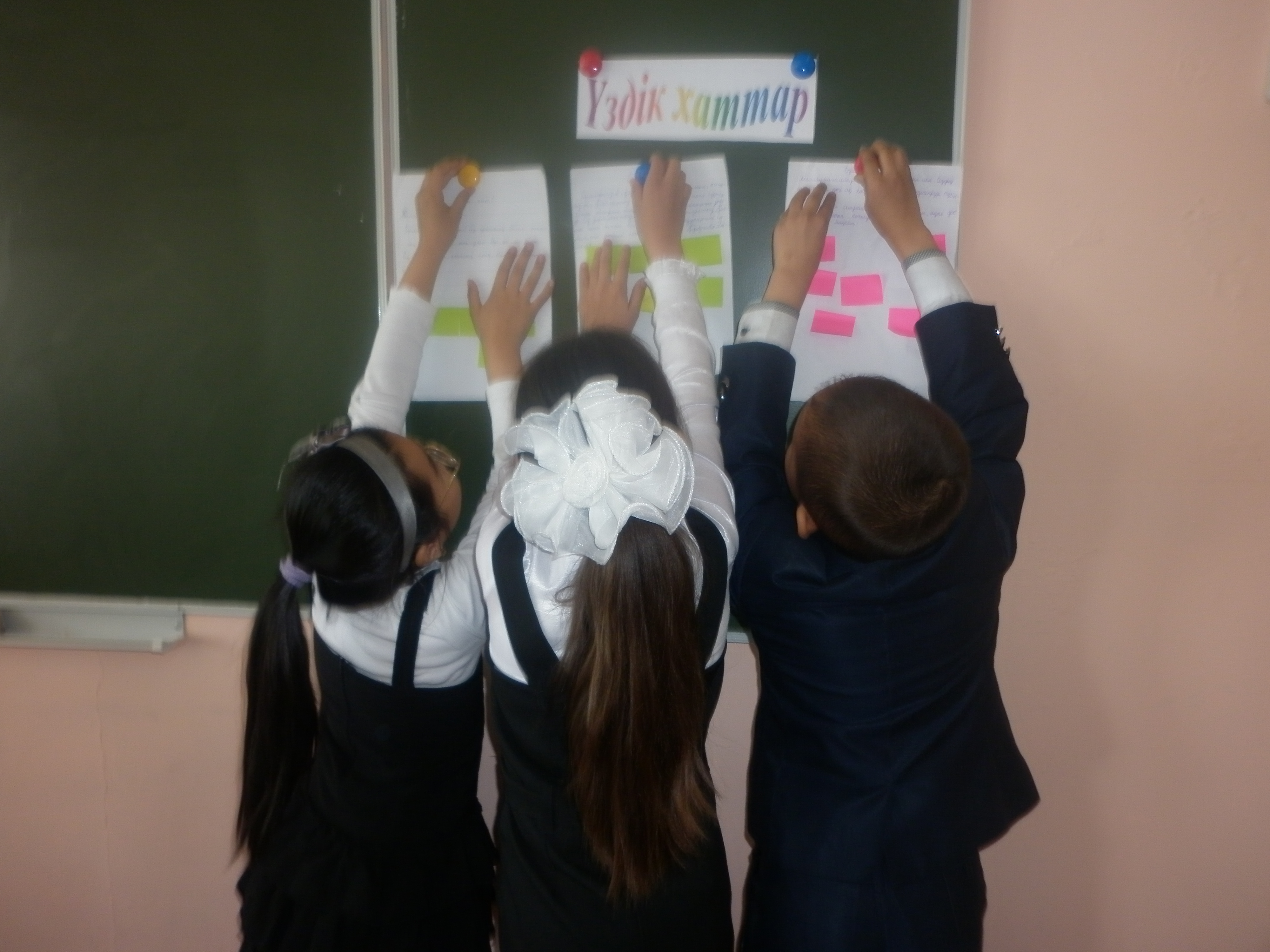 Үй тапсырмасын тексеру барысында «Ажалдан құтқарған асыл сөз» ертегісінің кейіпкерлері – хан мен қойшыға жазған хаттарын бір -біріне оқыды, өзара талдап, топтағы үздік хаттарды стикер жапсыру арқылы анықтауға қатысты. Өз ойларын ортаға салды. Үздік хаттар анықталды. Оларды жазған- Аделя, Эльмира, Мақсат және зерттеп жүрген оқушым–Ерасыл. Ерасылға бұл хатты жазуға анасы көмектесіпті. Ерасыл ханға жазған хатын ерекше бір сезіммен оқыды. / М.3, М.1/