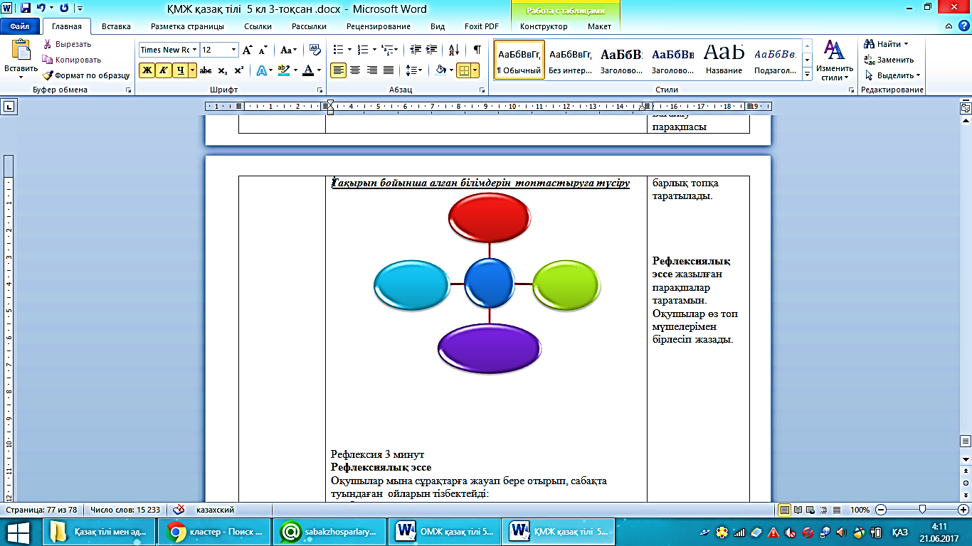 Төмендегі бос ұяшыққа сабақ туралы өз пікіріңізді жазыңыз. Сол ұяшықтағы Сіздің сабағыңыздың тақырыбына сəйкес келетін сұрақтарға жауап беріңіз. |