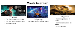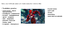 ORGANISATION MOMENT: 1.Teacher greets students and wishes good day. Divide pupils into 3 groups Set the lesson objectives 2. Revision of the previous lesson Do you watch films on TV or on a computer? Do you watch TV every day? Lead-in: 3.Look at the pictures and guess the theme of our lesson Today you will learn some new words connected with the film -Vocabulary practice: -Let’s watch the video. |