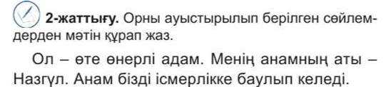 1.2.5.1.мұғалімнің қолдауымен мәтіннің, сюжетті суреттің мазмұны бойынша сұрақ қою, сұраққа жауап беру; 1.3.5.1 мұғалімнің қолдауымен сөз, сөйлем, мәтінді тексеру, қатені түзету; |