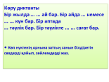 Тақырыпты ашу Кіріспе әңгіме жүргізу. – Балалар, сендердің сыныпта достарың бар ма? Ол кім? Достарыңа қандай көмек бересіңдер? Достарың ше? Дос болған ұнай ма? Достарыңның туған күнін білесіңдер ме? Жаңа тақырып 1-жаттығу. Мәтінмен жүргізілетін жұмыстар: 1.Мұғалім оқушылардың назарын өзіне аударады. 2.Өлеңді өзі оқиды. 3.Жеке оқушыларға оқытады. 4.Мазмұнына байланысты сұрақтар қояды. 5.Сөздік жұмыс. 6.Тізбектей оқытады. Дәптермен жұмыс. 2-жаттығу. Оқушыларға мақалды оқытады. Мағынасын сұрайды. Оқушылардың жауабын толықтырады. Көркем жазып, нешінші? сұрағына жауап беретін сөзді тапқызады. Б Өлеңдегі үш кейіпкердің мінездерін салыстыр.Саған қайсы бала көбірек ұнады? Мына сұрақтарға жауап бер Неше? Қанша? Нешінші? Жауап болған сөздермен сөйлем құрап айт. Сергіту сәті: «Достасу қадамдары» Шарты: Егер мен айтқан оймен келіссеңдер, алға қарай бір қадам, егер келіспесеңдер, артқа қарай бір қадам жасаңдар. –Достық танысудан бастала ма? –Досыңмен жиі ренжісесің бе? –Достыққа мейірімділік жараса ма? –Досыңның қателігін кешіресің бе? –Достық төбелестен бастала ма? –Достыққа татулық жараса ма? –Достыққа қамқорлық жараса ма? Достасу қадамдарын жиі жасаған оқушылар мадақталады 3-жаттығу Жұпта орындатады. Суреттегі заттарды санатады. Жұп бо йынша бір-біріне сұрақ қойып,екінші оқушы жауап береді Мағжанда қанша ...(асық) бар? Тауықтың неше ...балапаны) бар? Торда неше ... (тотықұс)отыр? ҚЖ: Көру диктанты Бір жылда ... ... ай бар. Бір айда ... немесе ... ... күн бар. Бір аптада ... тәулік бар. Бір тәулікте ... ... сағат бар. • Көп нүктенің орнына заттың санын білдіретін сөздерді қойып, сөйлемдерді жаздыру. |