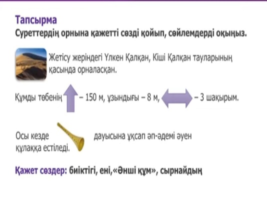 Функцианалдық сауаттылыққа құрылған тапсырма. 3- тапсырма. Берілген тірек сөздерді пайдаланып, иллюстрацияларды сипаттаңыздар. тірек сөздер: Әнші құм, Жетісу, ені, төбенің биіктігі, орналасқан, Кіші Қалқан, реактивті ұшақ, сырнайдың дауысы, Алматы облысы, ұқсайды. |