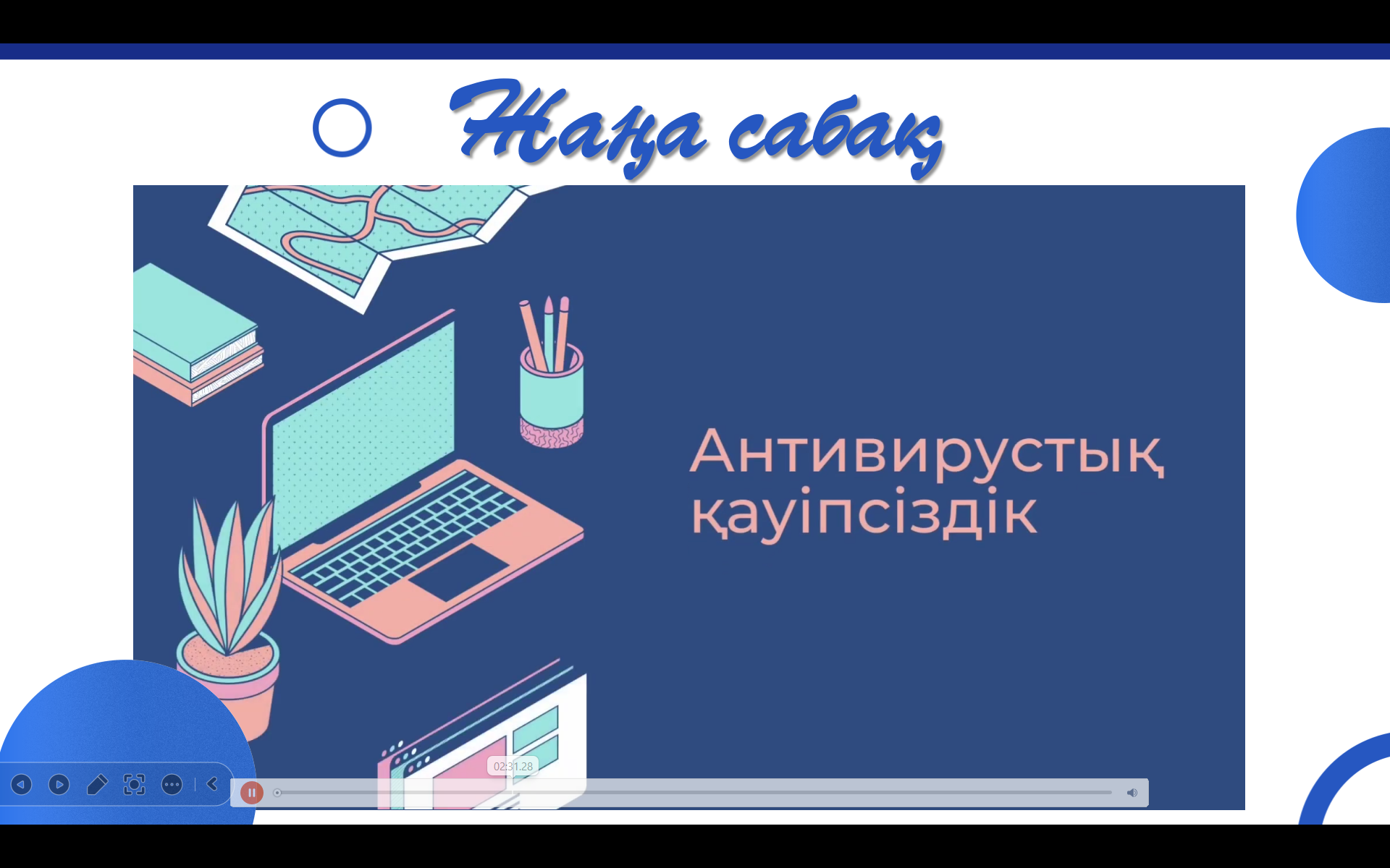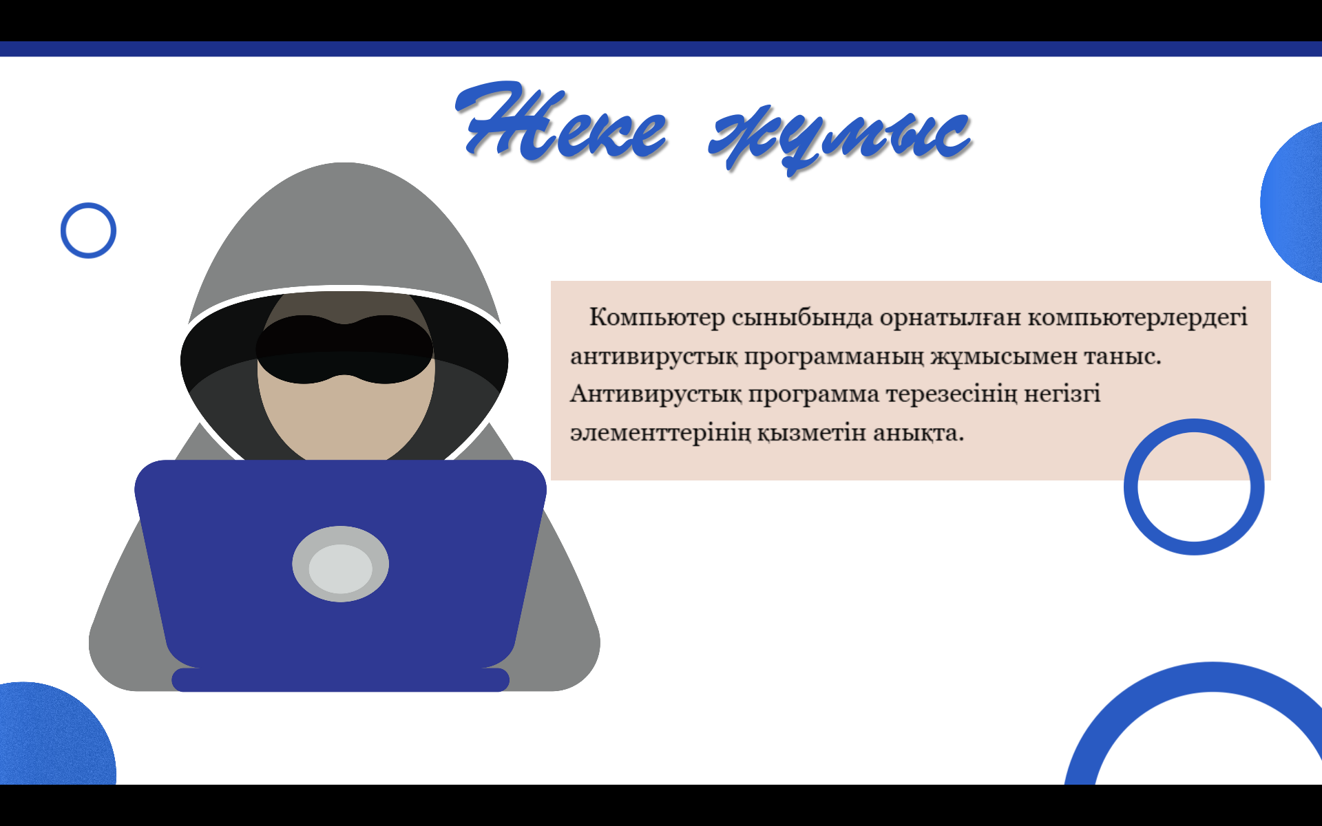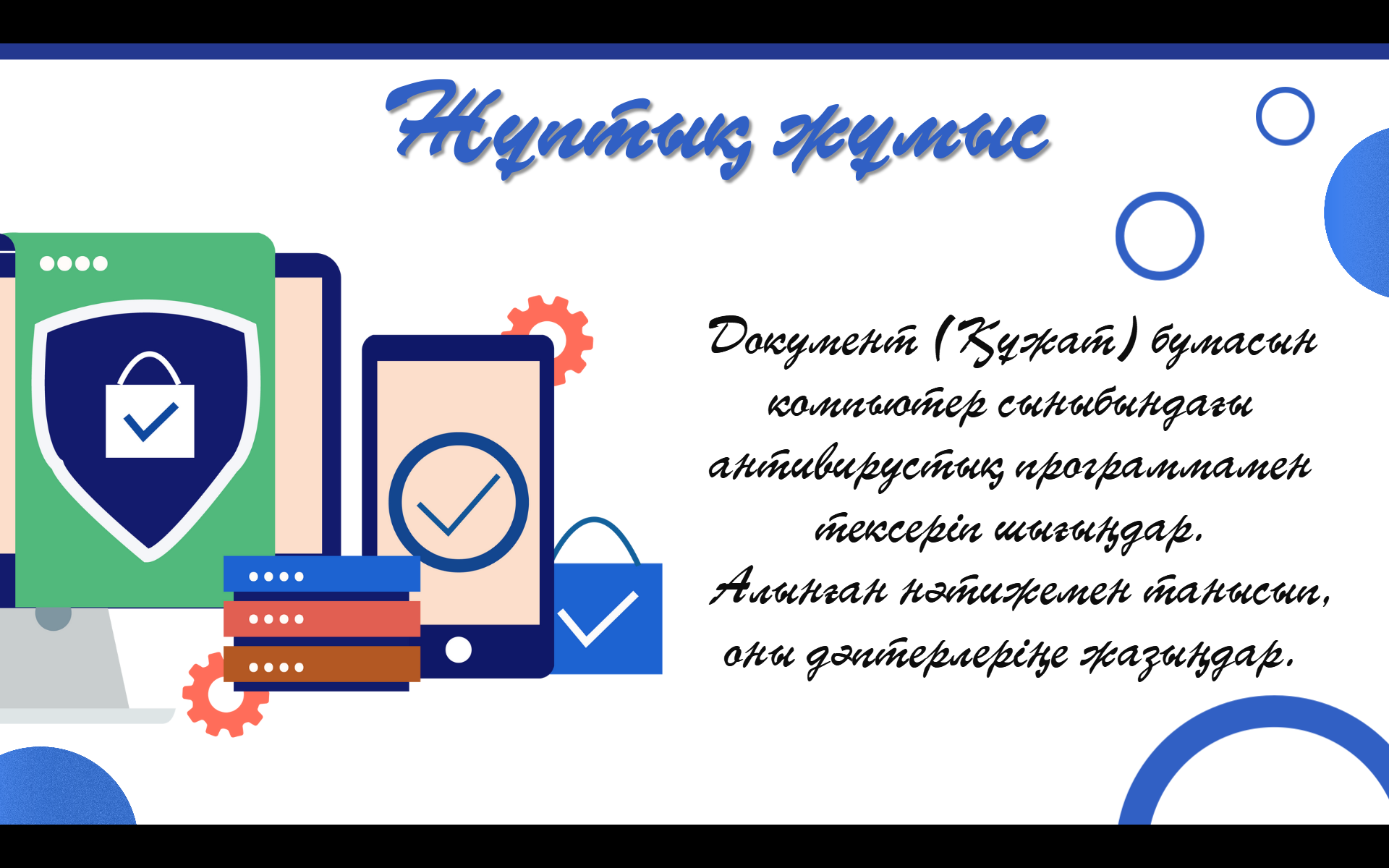 Тақырыпқа сай кішігірім жоба қорғайды. Компьютер кабинетіндегі антивирустық бағдарламаларды тексереді, анықтайды. Компьютерде тапсырма орындайды Көз жаттығуларын жасайды wordwall платформасында тапсырма орындайды |