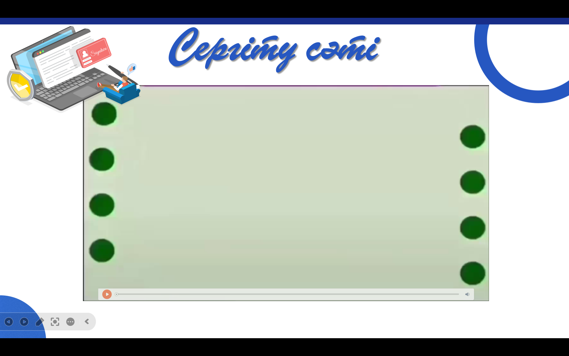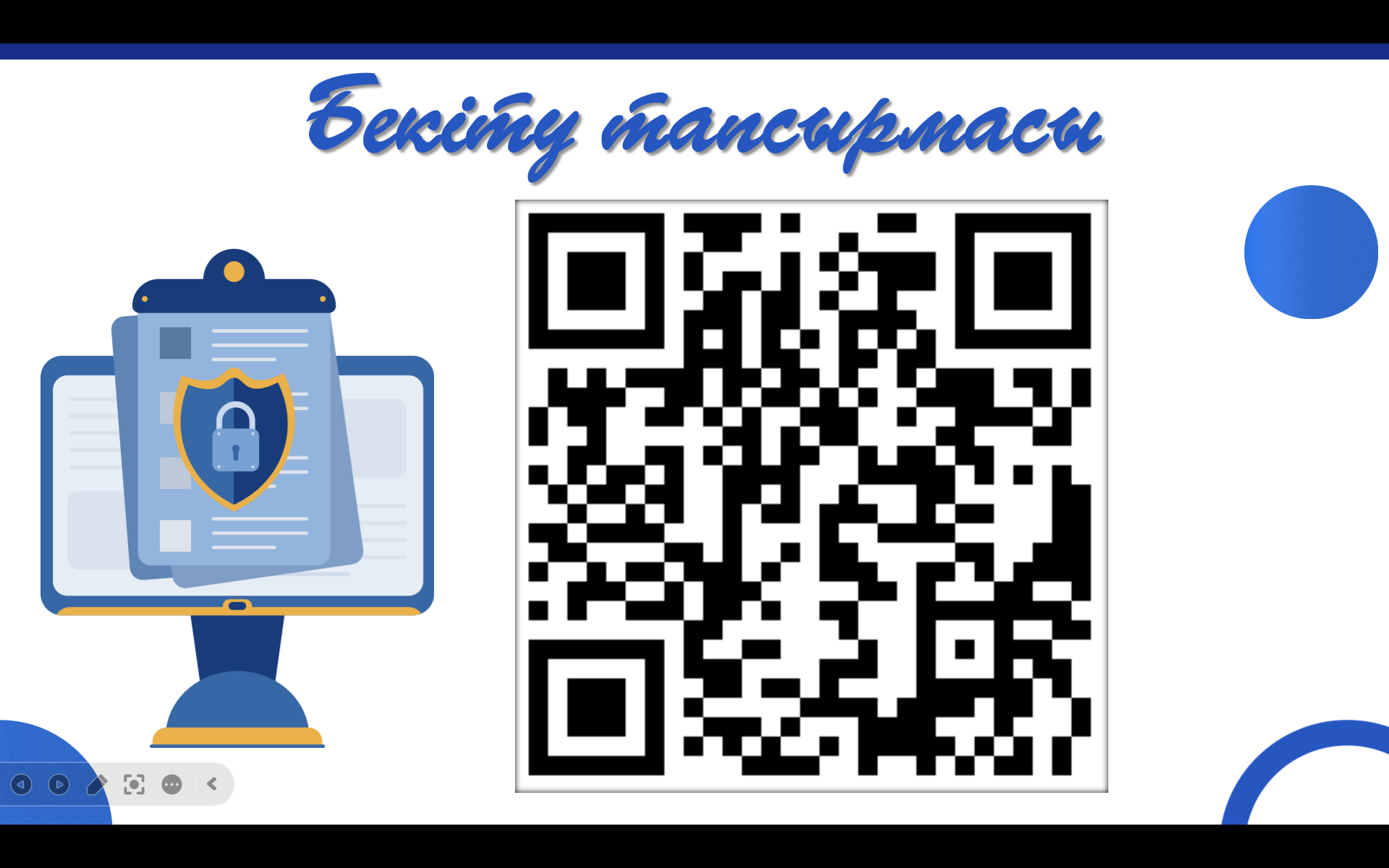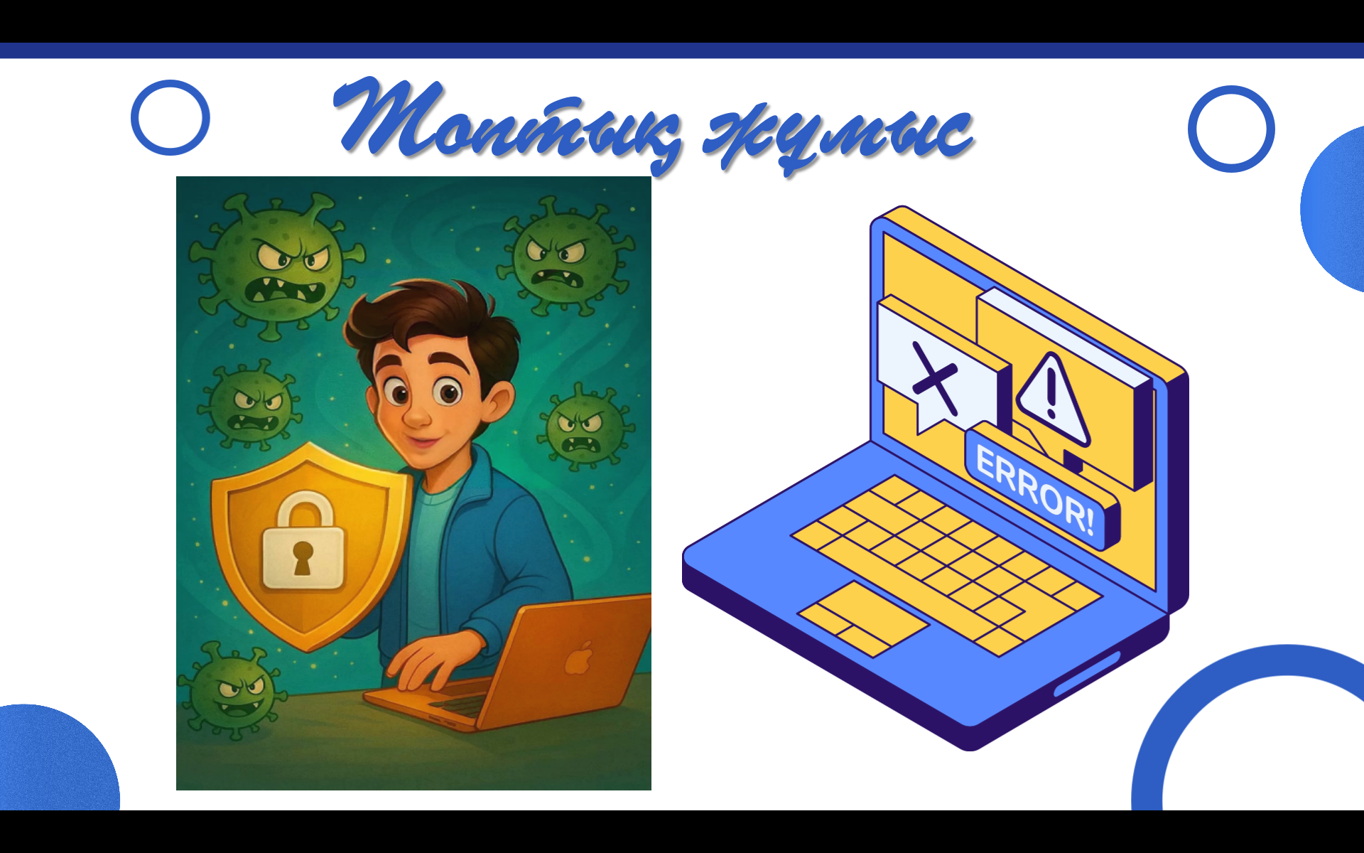 Тақырыпқа сай кішігірім жоба қорғайды. Компьютер кабинетіндегі антивирустық бағдарламаларды тексереді, анықтайды. Компьютерде тапсырма орындайды Көз жаттығуларын жасайды wordwall платформасында тапсырма орындайды |