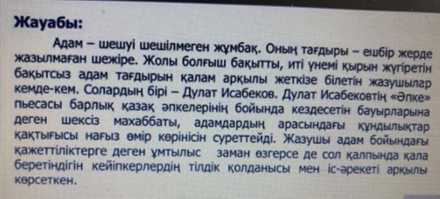 Жұптық жұмыс. «Әпке» драмасындағы материалдық және рухани құндылықтар жаңашылдыққа мысал бола алады ма? Ойыңызды дәлелдеп жазыңыз.