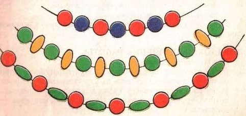 Педагог балаларға фигуралар жиынтығын – шеңберлерді, сопақшаларды, шаршыларды, тіктөртбұрыштарды таратады және өздерінің «моншақтарын» немесе өрнектерін жасауды ұсынады. Содан кейін, педагог өлшемі жақын шеңбер мен шаршыны, сопақша мен тіктөртбұрышты салыстыруды ұсынады. Балалар топпен жұмыс жасайды, фигуралардан өрнектер жасайды.