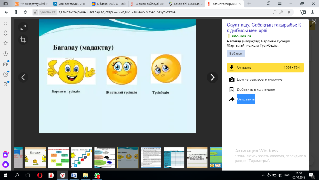 Кері байланыс «Бүгін сабақта....» әдісі арқылы сабақ бойынша кері байланыс жасайды. 1.Бүгін сабақта біле алдым... 2.Менің ойымша, біз үшін маңызды ... 3.Өзімнің бүгінгі жұмысымды сәтті деп есептеймін, өйткені... 4.Мен үшін қиындық тудырған ... |