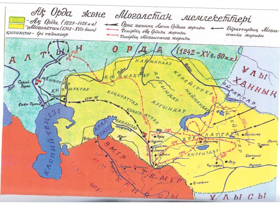 6.3.1.6 картаны қолданып XIII-XV ғасырлардағы мемлекеттердегі саяси үдерістерді түсіндіру; 6.1.1.2 XIII-XV ғасырлардағы мемлекеттердің этноәлеуметтік құрылымын анықтау 6.3.2.5 тарихи оқиғалардың өзара байланысын анықтап, Қазақстан аумағында XIII XV ғасырларда құрылған мемлекеттердің сыртқы саясатын түсіндіру |