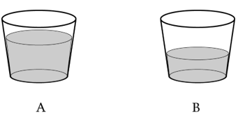 Оқушы екі бірдей шыныаяққа бірдей мөлшерде су құйды. Ол бір шыныаяқты тоңазытқышқа салып, екіншісін жылы бөлмеде қалдырды. Шыныаяқтардың ешқайсысына қол тигізбеді. Төмендегі суретте екі күннен кейін шыныаяқтарда қанша су қалғаны көрсетілген. Неліктен В шыныаяғындағы су көлемі өзгерді?// Ученик налил одинаковое количество воды в две одинаковые чашки. Он поставил одну чашку в холодильник, а другую оставил в теплой комнате. Ни одну из чашек не трогали. На рисунке ниже показано, сколько воды осталось в чашках через два дня. Почему изменился объем воды в чашке В?