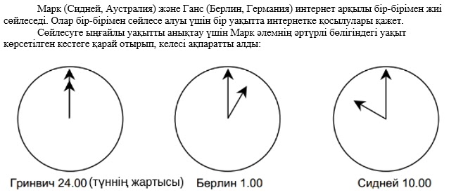 Марк пен Ганс жергілікті уақыт бойынша 9.00-ден 16.30-ға дейін сөйлесе алмайды, өйткені олар осы уақытта мектепте болулары қажет. Сондай-ақ, олар жергілікті уақыт бойынша 23.00-ден 7.00-ге дейін сөйлесе алмайды, өйткені олар осы уақытта ұйықтайды. Оларға сөйлесу үшін қай уақыт ыңғайлы болар еді? *