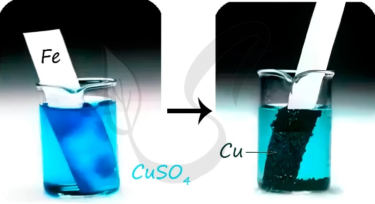Зертхана бөлмесінен лаборант көгілдір мыс (ІІ) сульфатын алды. Қораптан темір тақташасын алып, мыс (ІІ) сульфатына салды. Қандай реакция типі орындалды? || Из помещения лаборатории лаборант взял раствор сульфата меди (II) голубого цвета. Достал из коробки железную пластину и опустил в сульфат меди (II). Какой тип реакции был выполнен?