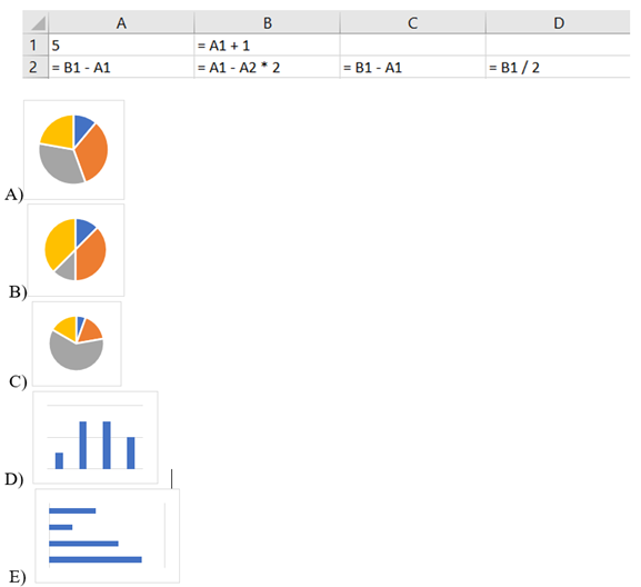 Формулаларды көрсету режимінде электрондық кестенің фрагменті берілген. A2 ұяшықтар диапазонының мәндері бойынша есептеулер жүргізілгеннен кейін диаграмма құрылған. Алынған диаграмманы көрсетіңіз. || Дан фрагмент электронной таблицы в режиме отображения формул. После выполнения вычислений по значениям ячеек диапазона A2:D2 была построена диаграмма. Укажите получившуюся диаграмму.