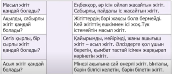 Оқушылар өзіне қандай жақсы мінез керек екендігін айтып, көршісіне қандай жақсы мінез сыйлайтындығын айтады. Қабырғадағы суреттерді таңдау арқылы оқушылар сұрақтарға жауап береді. Оқушылар қойылған сұрақтарға жауап бере отырып, бүгінгі сабақ тақырыбын анықтайды. Оқушылар жаңа сөздермен танысып, мағынасын түсінеді. Оқушылар жұтасып, тірек сызбаларды орындау арқылы кейіпкер бейнесін ашады. Өлең мазмұнын түсіне отырып, сұрақтардың жауабын сәйкестендіреді. «Заманауи жігіттердің бойында қандай қасиеттер болуы керек» деген тақырып бойынша оқушылар пікірлерін айтады. |