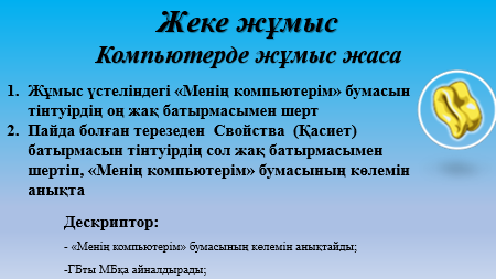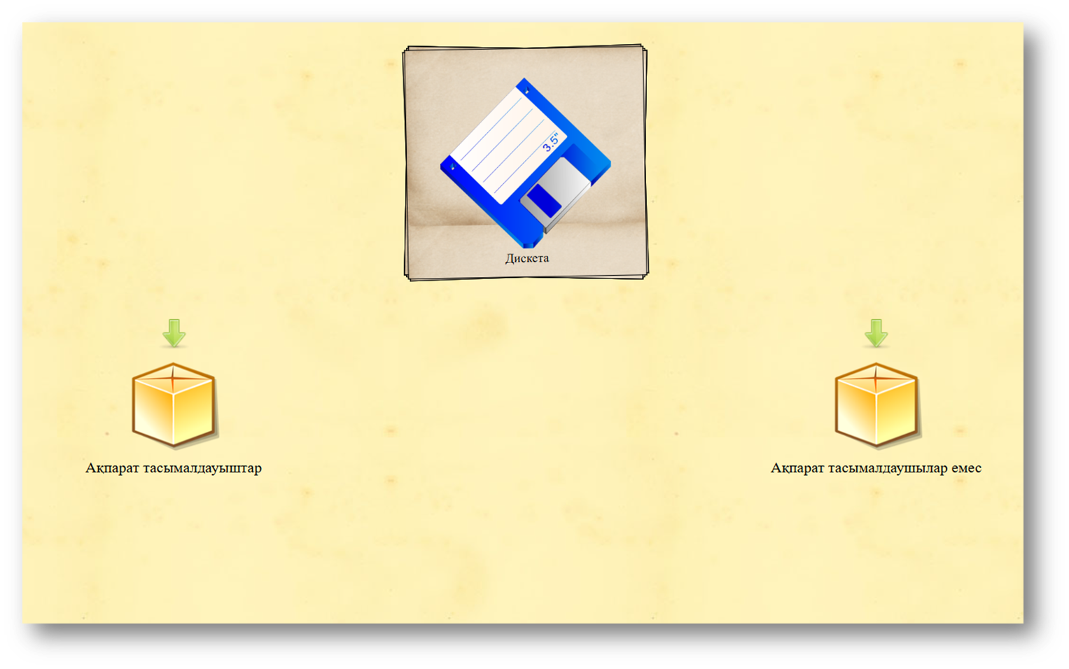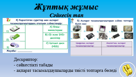 Дескриптор: - кодты сканерлеп, 3Д бейнені көреді; - цифрлық тасымалдағыштарды табады; -өмірмен байланыстыраайтады; - мысал келтіреді. Дескриптор: - сәйкестікті табады - ақпарат тасымалдаушыларды тиісті топтарға бөледі Дескриптор: - «Менің компьютерім» бумасының көлемін анықтайды; -ГБты МБқа айналдырады Дескриптор: - ақпарат тасымалдағыштарды табады; -ақпарат тасымалдағыш еместерді табады. |