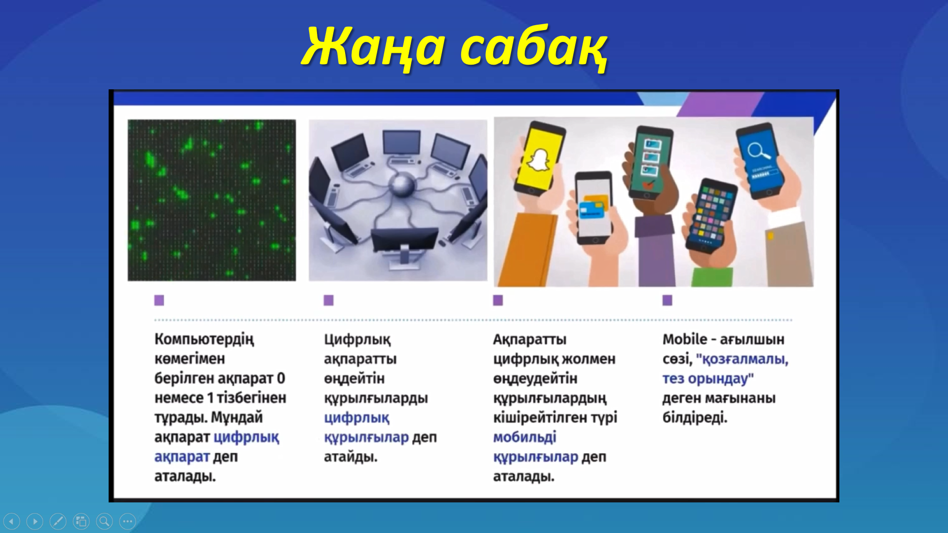 Бейне сабақты көреді; Мұғалімді тыңдайды. Жаңа ақапараттармен танысады; Ақпарат тасымалдағыш-тарды дәптерге жазады Тапсырманы орындайды Жұптасып тапсырманы орындайды Компьютерде жекелей орындайды Тасымалдағыш құралдарды топтастырады |
