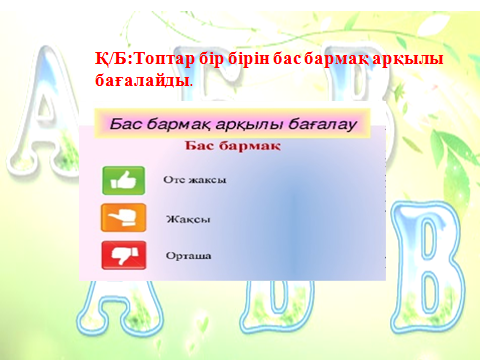 Қ/Б: Топтар бір бірін бас бармақ әдісі арқылы бағалайды. Тапсырма:1 А – деңгей Білгеніңді жинақтап, жаз. (жеке жұмыс, дәптермен жұмыс) (5 мин)