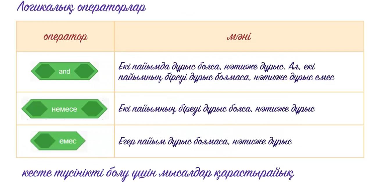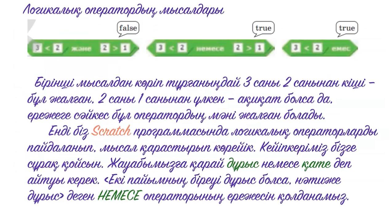 Нақты өмірде көптеген нысандар мен құбылыстардың қасиеттері екі мәнмен анықталады: иә және жоқ.Саған айтылған ақпараттар ақиқат немесе жалған деп сипатталуы мүмкін. Дәл осы қағида сияқты Scratch сияқты Scratch-те логикалық операторды пайдаланып, логикалық пікірді анықтауға болады. Логикалық операторларды пайдалана отырып, біз ақиқат немесе жалған деген пікірлердің бір нәтижесін алу үшін, қатынастардың, екі немесе одан көп өрнектердің мәндерін салыстыра аламыз.