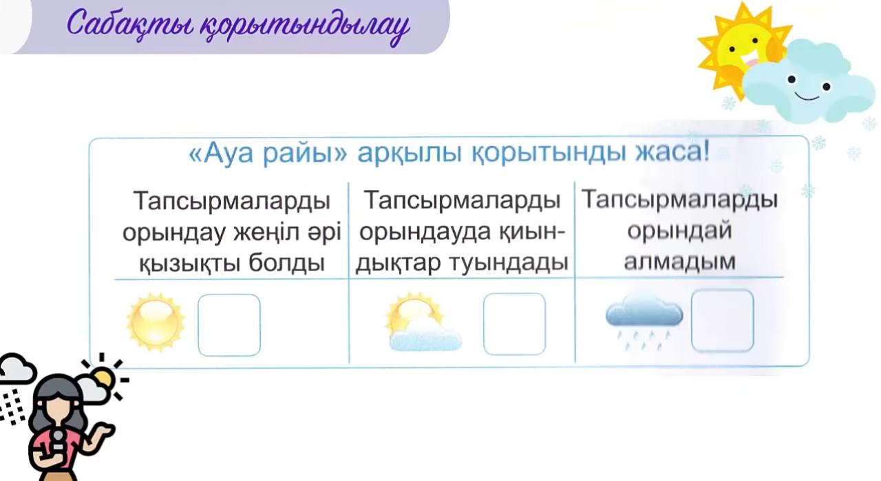 1.Оқушыларға өзін-өзі бағалауды ұйымдастырады. 2.Кері байланыс: «Бір ауыз сөз» Ұнады, қажет, пайдалы, білдім, үйрендім, қызықтым, есте сақтадым |