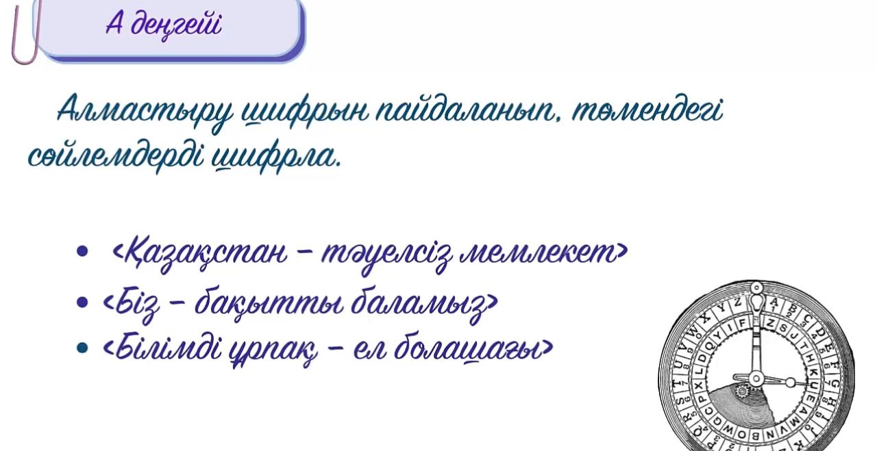 Жаңа тақырыпты түсіндіру. Ақпаратты қорғаумен айналысатын арнайы ғылым саласы бар. Бұл ғылым саласы криптология деп аталады. Криптология «криптография» (шифрлау) және «криптоталдау» деген екі бөлімге жіктеледі. Криптография айналысатын адамды криптограф деп атайды. Криптограф хабардың құпиялылығын және нақтылығын қамтамасыз етеді. Криптология ғылымының мақсаты- ашық мәтінді бөгде адам оқи алмайтындай етіп өзгертетін математикалық әдістерді іздеу. Криптографтың ашық мәтінге қолданылған амалынан кейінгі нәтижені шифрланған мәтін немесе криптограмма деп атаймыз. Ашық мәтінді шифрлау үшін криптограф әрқашан құпия кілтті қолданады. Бұзылуы мен ашылуына жол бермейтін шифрдың қабілетін шифрдың беріктілігі деп аталады. Көрсетілім.Шифрлаудың алмастыру әдісі. Жеке жұмыс. 1-тапсырма. Оқулық 24 бет А денгейі
