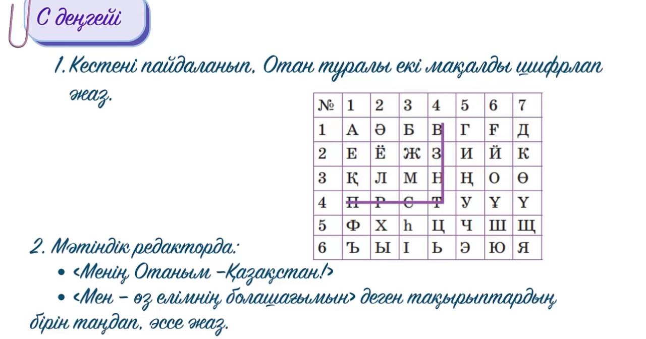 Дескриптор: -Цезарь кодымен берілген сөздерді декодтау орындайды, әр қала 1 балл ҚБ: жұлдыз /3балл/ 3-тапсырма. Оқулық 24 бет С денгейі