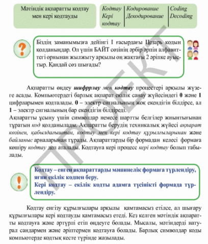 Барлығы: Ақпарат тты шифрлеу мен кодттауды түсінеді. Көбі:Жұмыс Ақпарат және код ұғымын қалыптастырады. Кейбірі: Анық және толық сөйлеу арқылы, мәселені түсінгенін көрсетеді. |